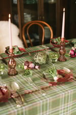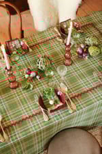 Mantel de algodón con estampado a cuadros en tonos verdes. Con detalle en piquillo rojo central formando un rectángulo y como remate de perímetro.